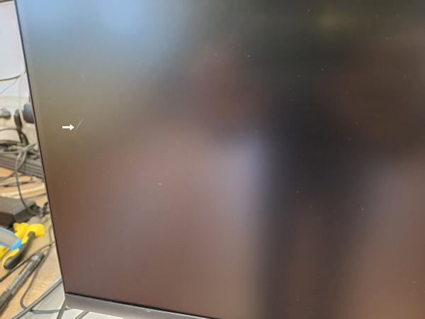 Opis napake: mini praskica na levem robu zaslona (oglejte si slike). Za delo povsem nemoteče.